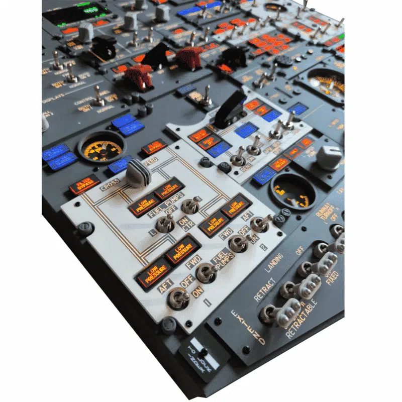 Le panneau de tête avant est stratifié d'acrylique gris épais et comporte des décalcomanies de haute qualité qui assurent la précision visuelle exigée par les écoles de pilotage. Les boutons et boutons rotatifs sont tactiles, offrant une véritable sensation de bouton-poussoir et un contrôle rotatif fluide, essentiels pour l'entraînement et l'utilisation en simulation. Le panneau entier est structuré sur un cadre Dibond robuste, mesurant 695 mm sur 660 mm, avec une profondeur d'environ 80 mm, parfait pour le montage dans les cockpits ou les configurations de simulateurs de vol.