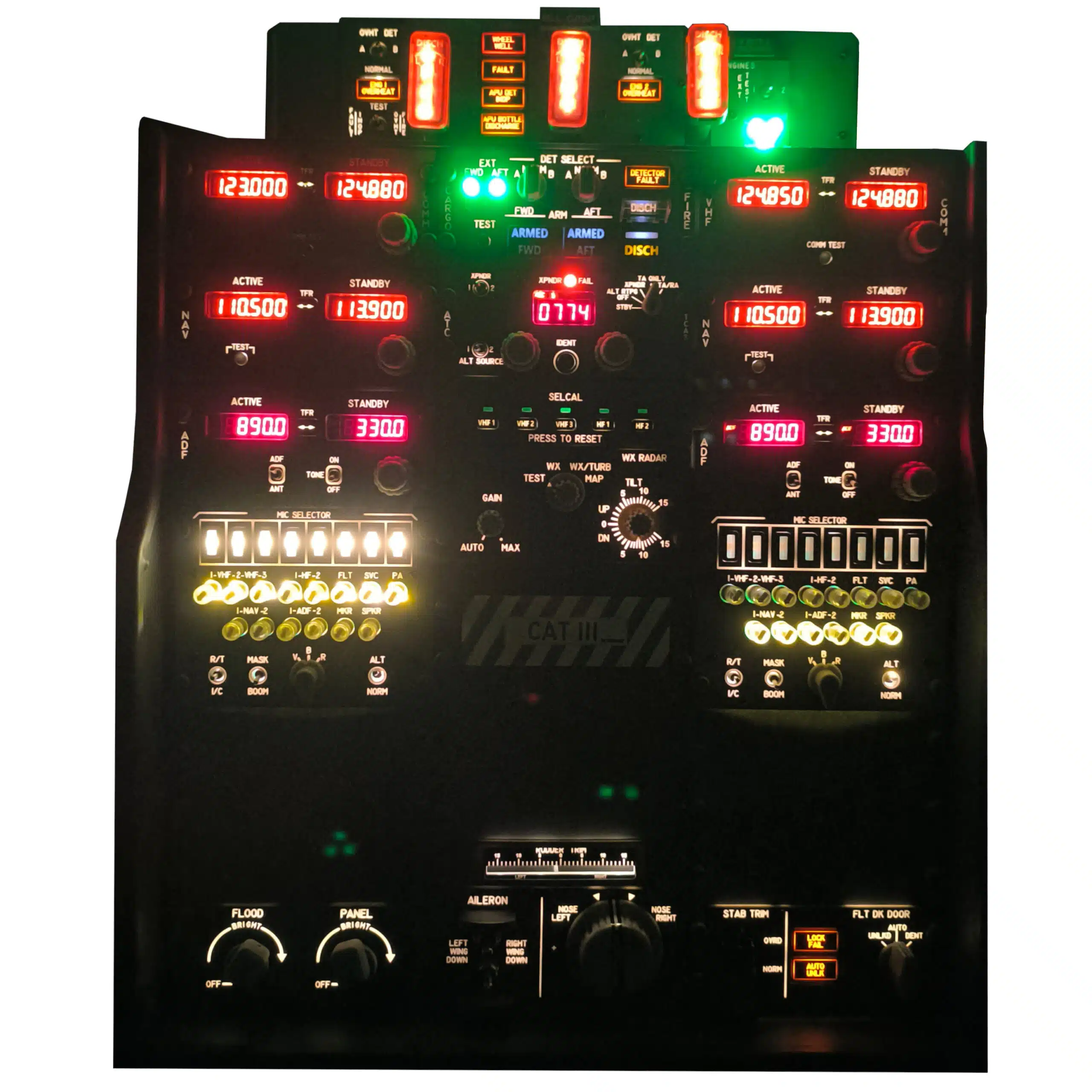 Le panneau et les boutons disposent d'un éclairage de fond blanc chaud pour une utilisation confortable de nuit, tandis que les panneaux radio ont des affichages à 7 segments à LED rouges.