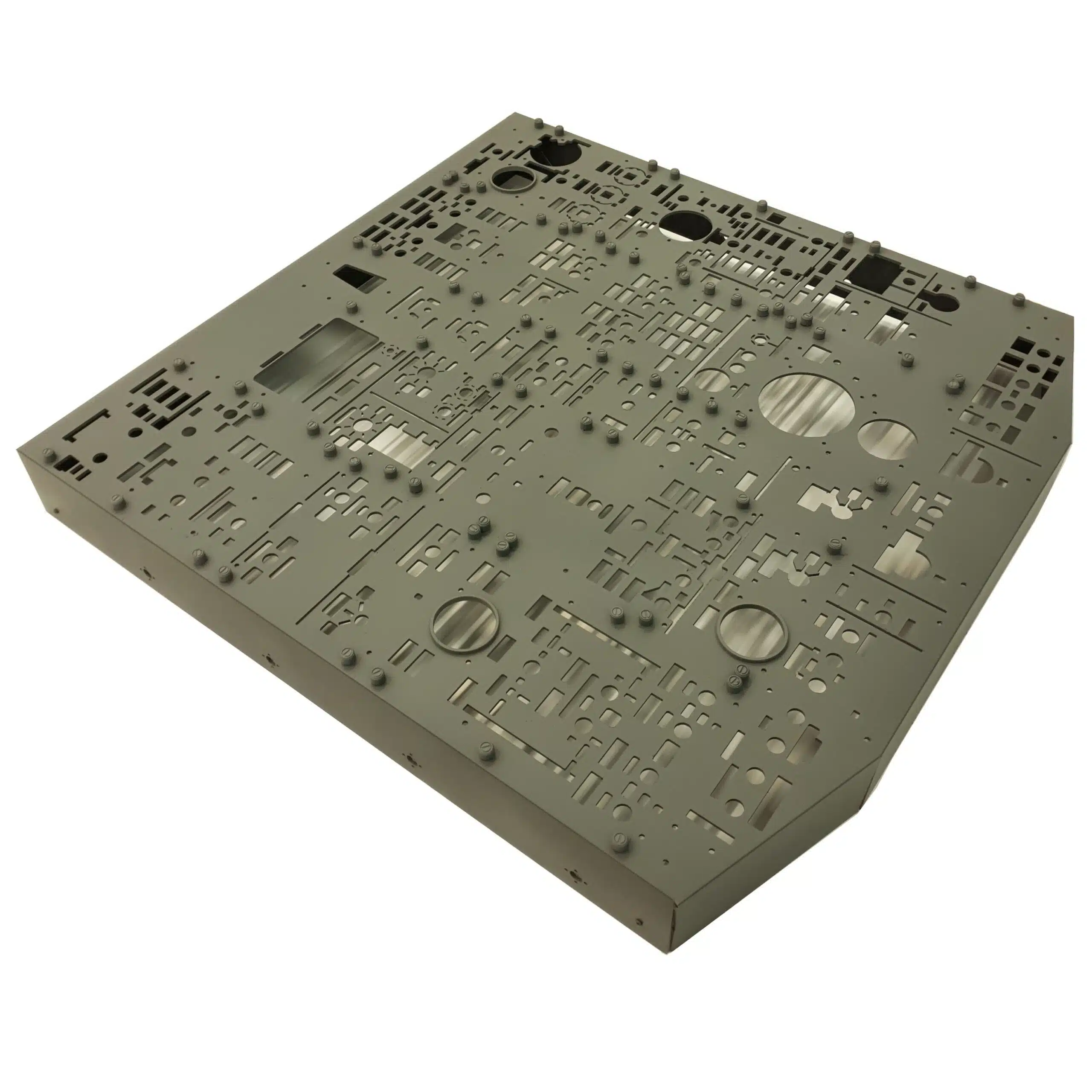 Przednia nadbudowa jest warstwowa z grubego szarego akrylu i zawiera wysokiej jakości dekale zapewniające dokładność wizualną wymaganą przez szkoły lotnicze. Przyciski i pokrętła obrotowe są wyczuwalne, oferując prawdziwe wrażenie przyciskania i płynne sterowanie obrotowe, niezbędne w szkoleniach i symulacjach. Cały panel jest zbudowany na solidnej ramie Dibond, mierzącej 695 mm na 660 mm, z głębokością około 80 mm, idealnie nadającej się do montażu w kokpitach lub konfiguracjach symulatorów lotu.