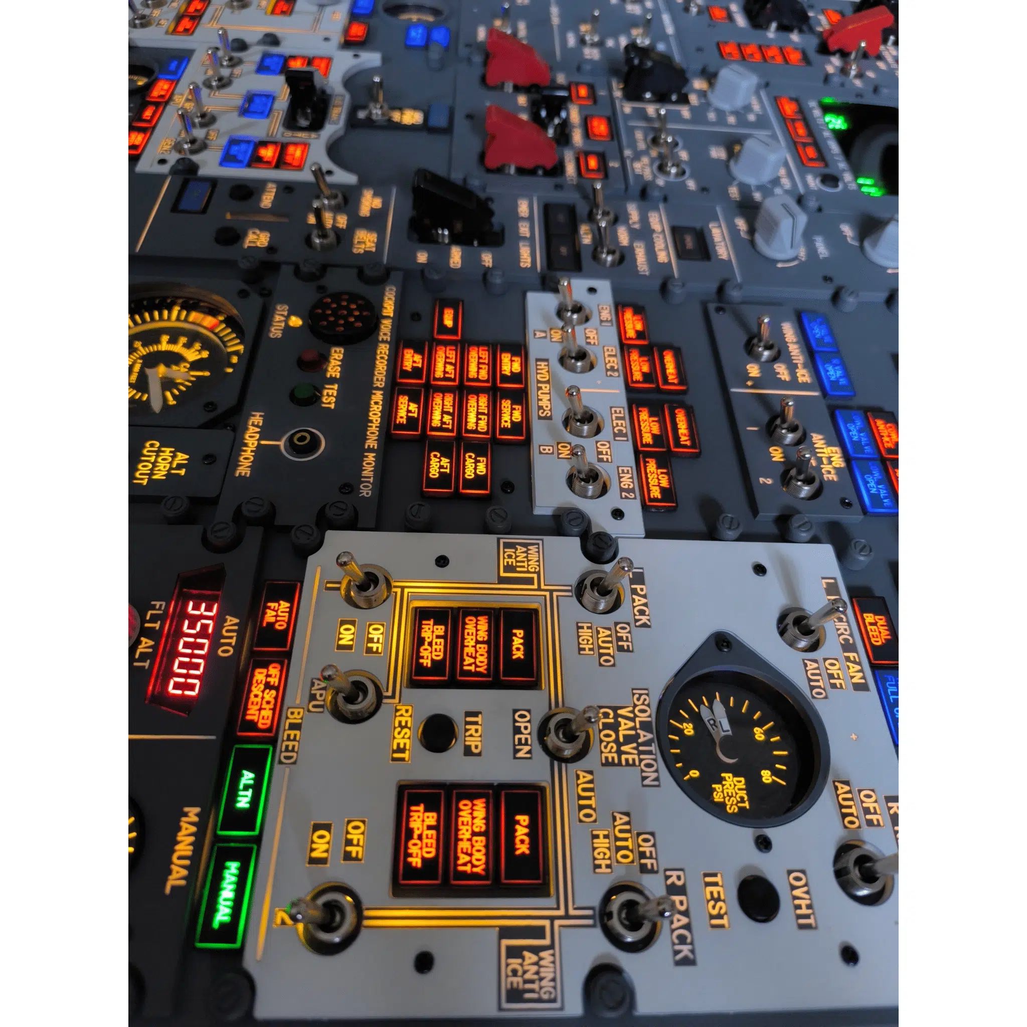 Ten zespół przedniej nadbudowy oferuje niezrównany szczegół, obejmujący wszystkie dekale, sygnalizatory, skrzynki sygnalizatorów, wierne repliki przycisków i pokręteł zaprojektowane jako przyciski i pokrętła obrotowe, niektóre z nich oznaczone, a niektóre bez oznaczenia, dla całkowicie immersyjnego doświadczenia symulacji lotu. Panel jest fachowo zamontowany na ramie Dibond, gotowej do łatwej instalacji w dowolnej konfiguracji kokpitu.